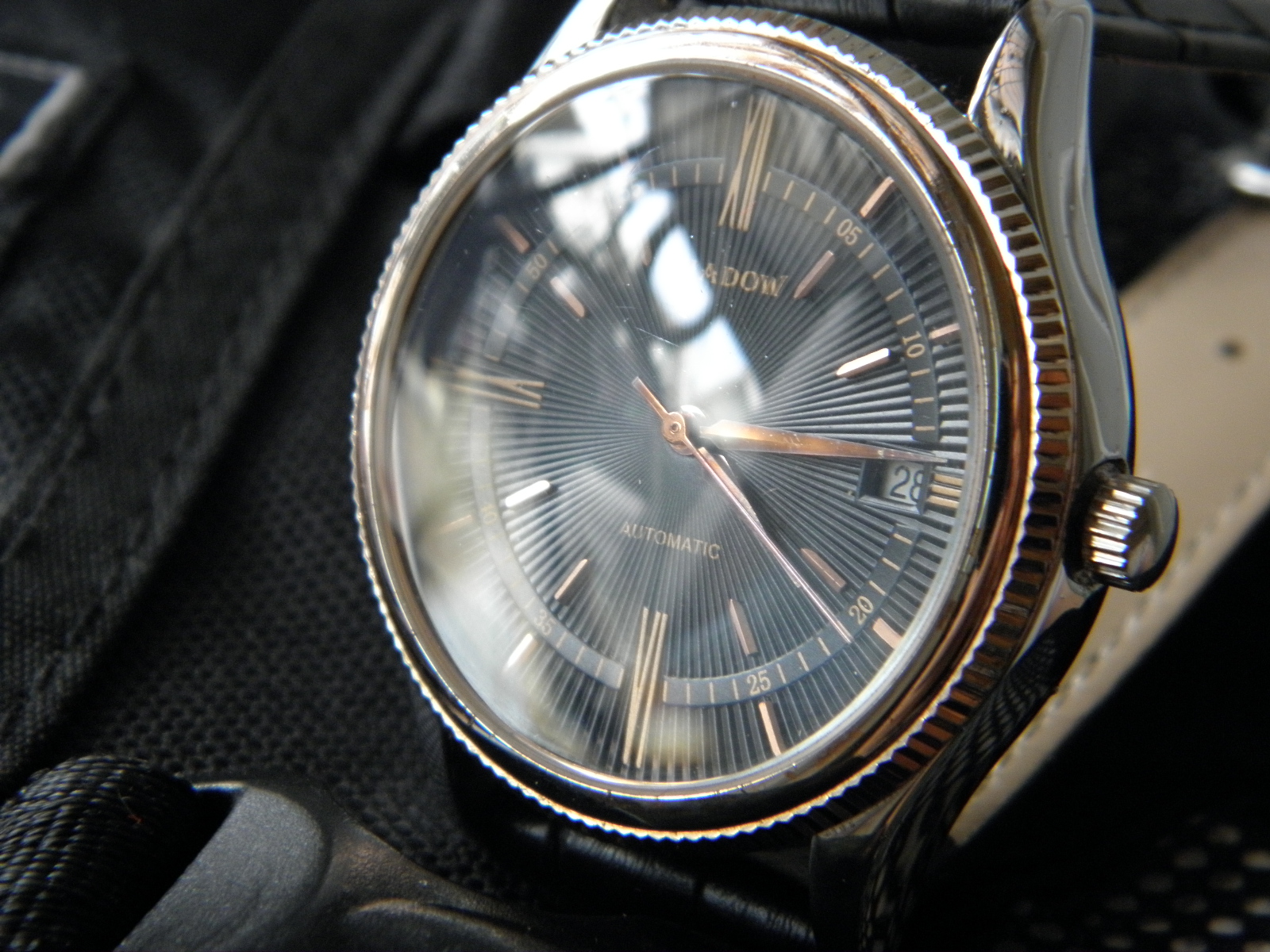 Dial bertekstur sunburst dengan kombinasi hands dan index goldtone